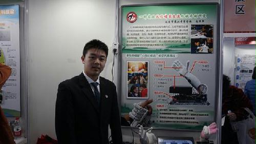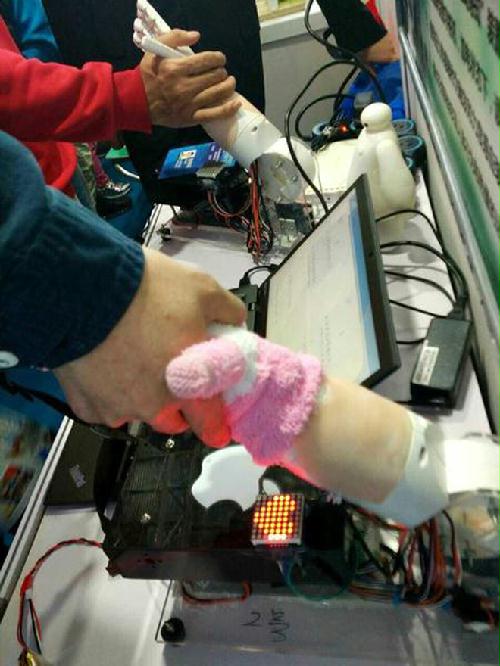在第36届北京青少年科技创新大赛上展出了一款可以远程传递情感的机械手,可以做握手的动作,也可以远程传递感情。这款作品的作者是来自北京第二中学分校的初三学生张梓轩。