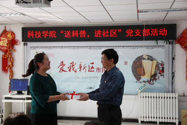 活动中,进修学院在职党支部书记王立新同志代表学院全体党员干部向社区居民赠送了《院士专家谈创新》、《社区科学素质读本》等100本科普书籍。同时,党支部邀请到了北京和睦家医院刘瑞凝博士为社区居民就《骨质疏松的预防与自我检测》进行现场授课和讲解,30多位社区居民参加了讲座活动,大家积极互动、受益匪浅,纷纷对党支部开展科普进社区的活动形式表示了支持和肯定。
